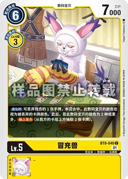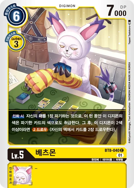 When Digivolving You may trash 1 card in your hand to treat this Digimon as also having the colors of the trashed card for the turn. Then, if this Digimon has 2 or more colors, Draw 2. (Draw 2 cards from your deck.)