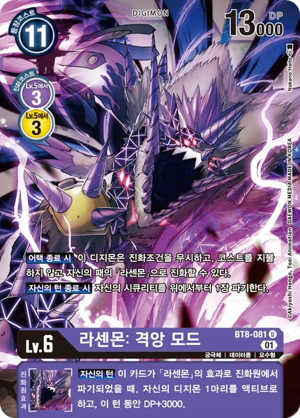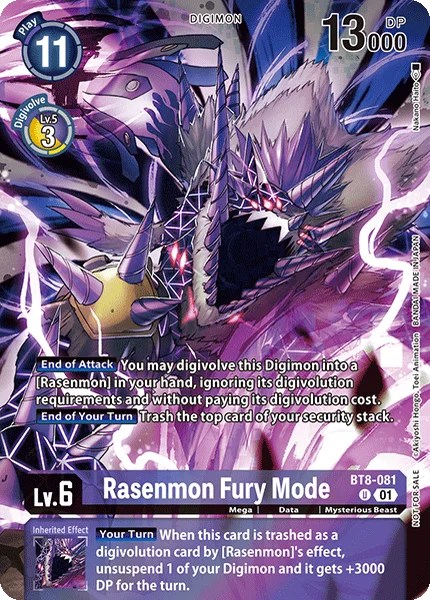 End of Attack You may digivolve this Digimon into a [Rasenmon] in your hand, ignoring its digivolution requirements and without paying its digivolution cost.End of Your Turn Trash the top card of your security stack.