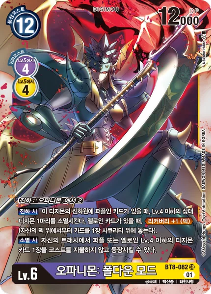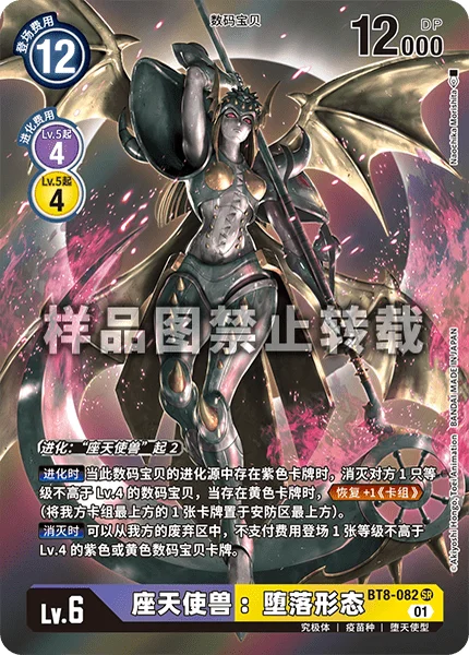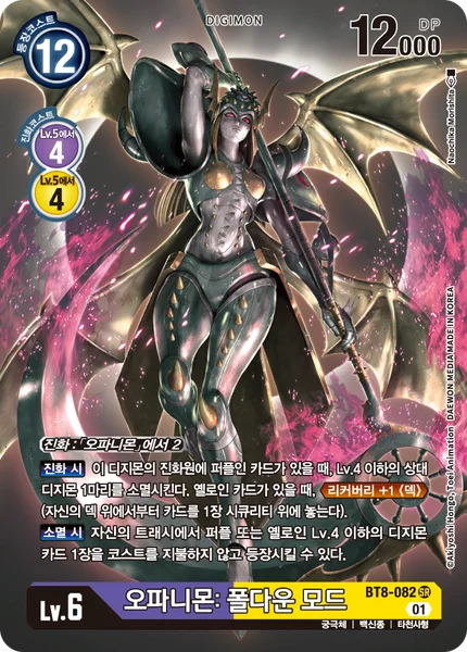 Digivolve 2 from [Ophanimon]When Digivolving If this Digimon has a purple card in its digivolution cards, delete 1 of your opponent's level 4 or lower Digimon. If this Digimon has a yellow card in its digivolution cards, Recovery +1 (Deck). (Place the top card of your deck on top of your security stack.)On Deletion You may play 1 purple or yellow level 4 or lower Digimon card from your trash without paying its memory cost.
