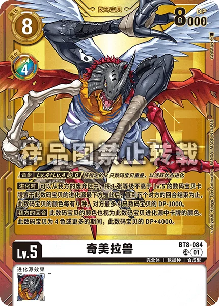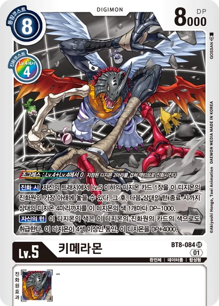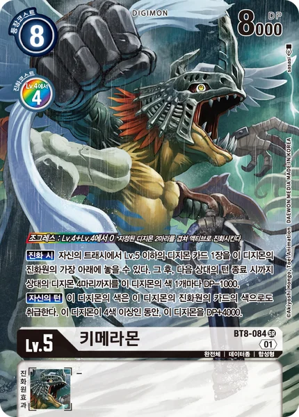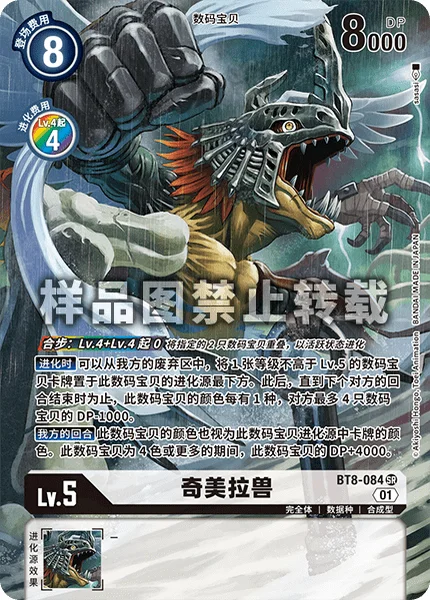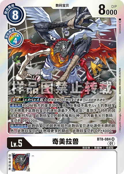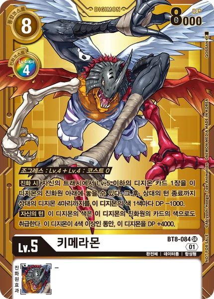 When Digivolving You may place 1 level 5 or lower Digimon card from your trash under this Digimon as its bottom digivolution card. Then, up to 4 of your opponent's Digimon get -1000 DP for each of this Digimon's colors until the end of your opponent's next turn.Your Turn This Digimon is treated as also having the colors of its digivolution cards. While this Digimon has 4 or more colors, it gets +4000 DP.