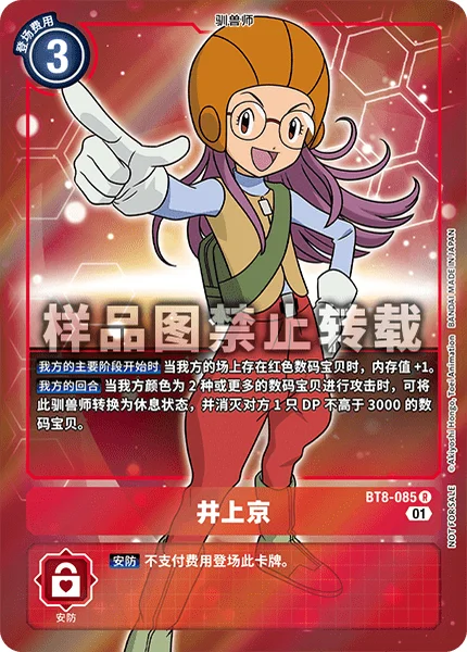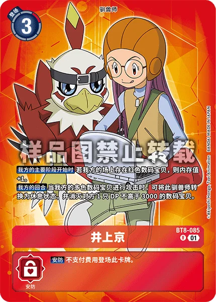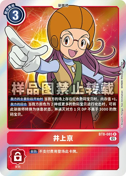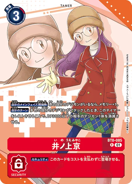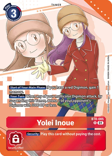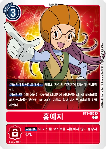 Start of Your Main Phase If you have a red Digimon in play, gain 1 memory.Your Turn When one of your Digimon with 2 or more colors attacks, you may suspend this Tamer to delete 1 of your opponent's Digimon with 3000 DP or less.