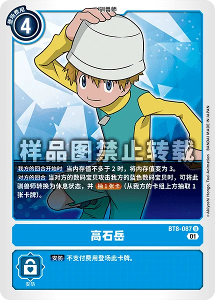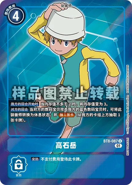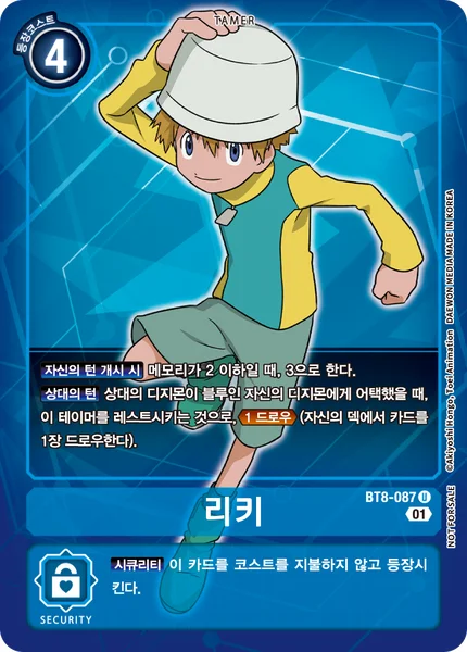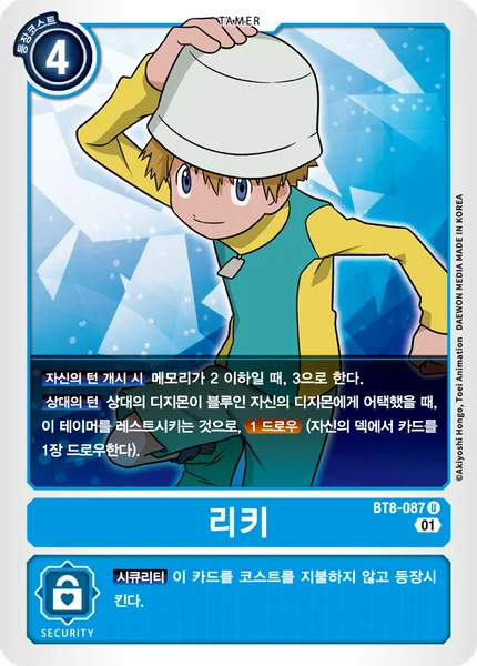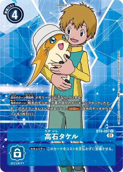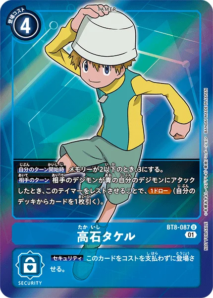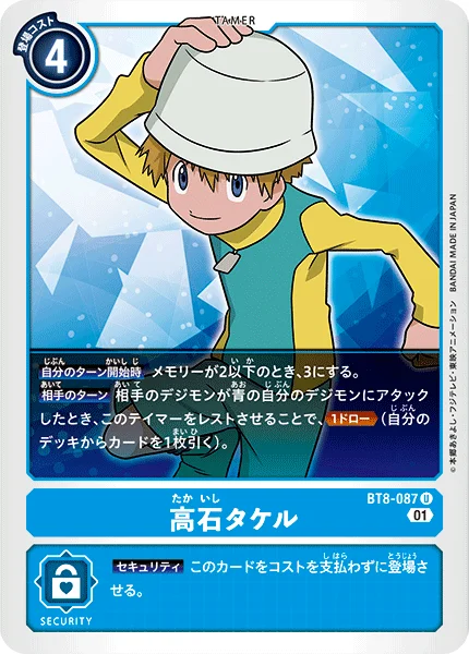 Start of Your Turn If you have 2 memory or less, set your memory to 3.Opponent's Turn When one of your opponent's Digimon attacks one of your blue Digimon, you may suspend this Tamer to Draw 1. (Draw 1 card from your deck.)