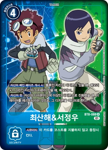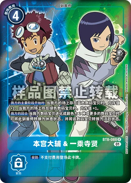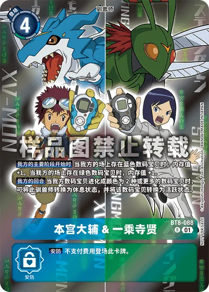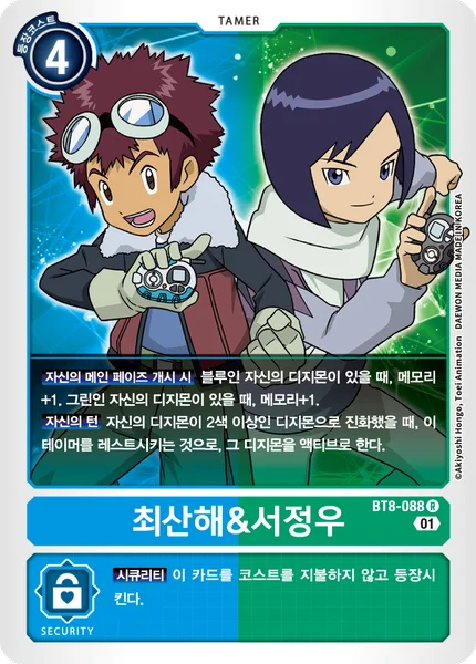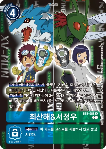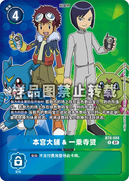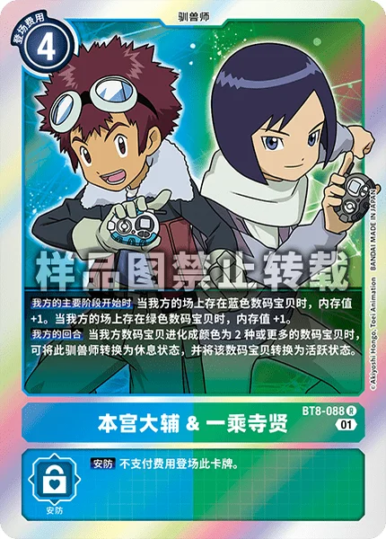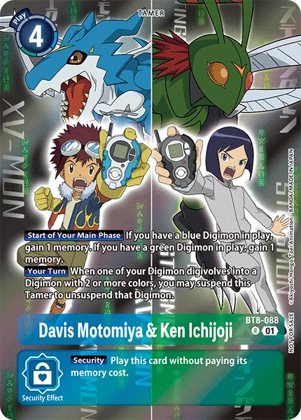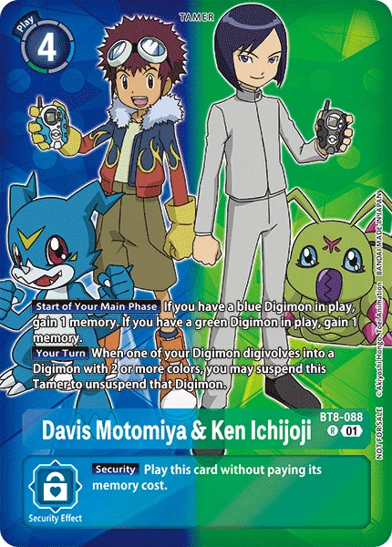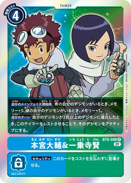 Start of Your Main Phase If you have a blue Digimon in play, gain 1 memory. If you have a green Digimon in play, gain 1 memory.Your Turn When one of your Digimon digivolves into a Digimon with 2 or more colors, you may suspend this Tamer to unsuspend that Digimon.
