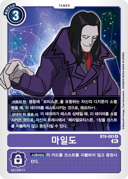 All Turns When one of your Digimon with [Myotismon] in its name is deleted, you may suspend this Tamer to gain 1 memory.End of Opponent's Turn If this Tamer is suspended, you may delete this Tamer to play 1 [MaloMyotismon] from your trash without paying its memory cost.