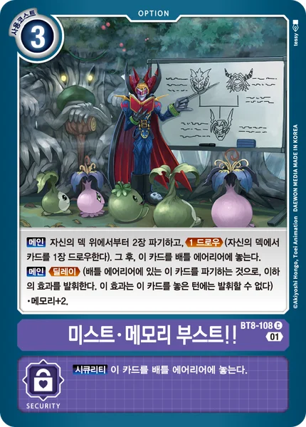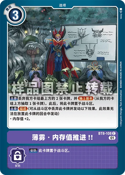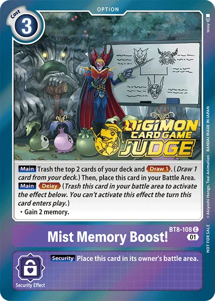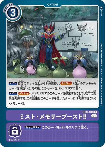 Main Trash the top 2 cards of your deck and Draw 1. (Draw 1 card from your deck.) Then, place this card in your Battle Area.Main Delay (Trash this card in your battle area to activate the effect below. You can't activate this effect the turn this card enters play.)・Gain 2 memory.