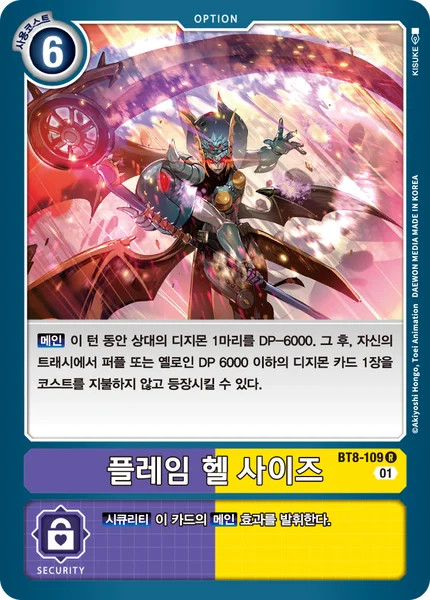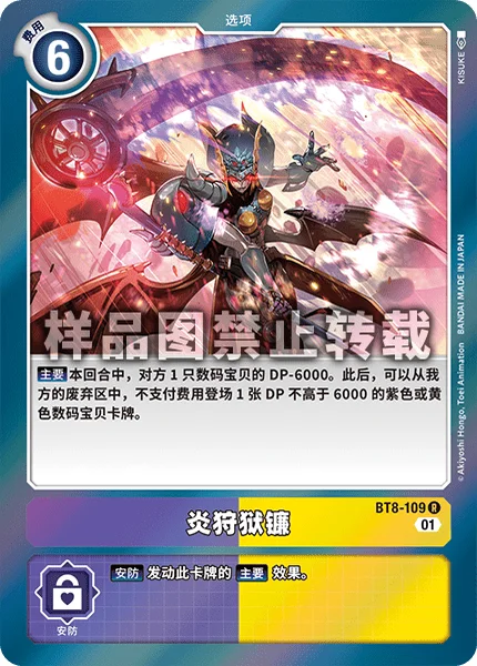 Main 1 of your opponent's Digimon gets -6000 DP for the turn. Then, you may play 1 purple or yellow Digimon card with 6000 DP or less from your trash without paying its memory cost.