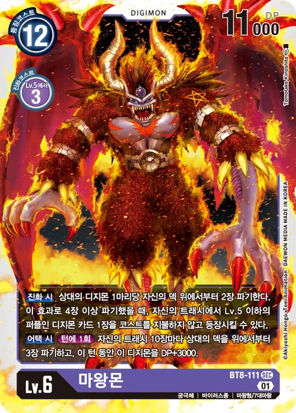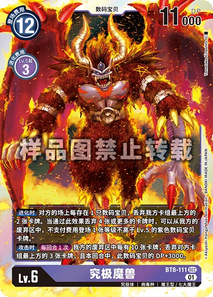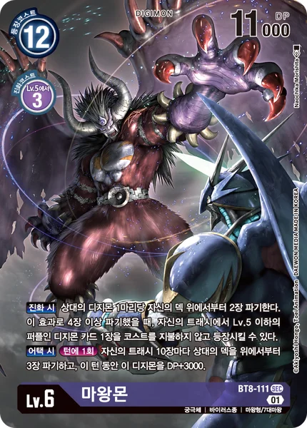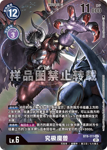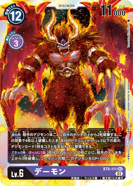When Digivolving Trash the top 2 cards of your deck for each of your opponent's Digimon in play. If you trash 4 or more cards with this effect, you may play 1 level 5 or lower purple Digimon card from your trash without paying its memory cost.When AttackingOnce Per Turn For every 10 cards in your trash, trash the top 3 cards of your opponent's deck, and this Digimon gets +3000 DP for the turn.