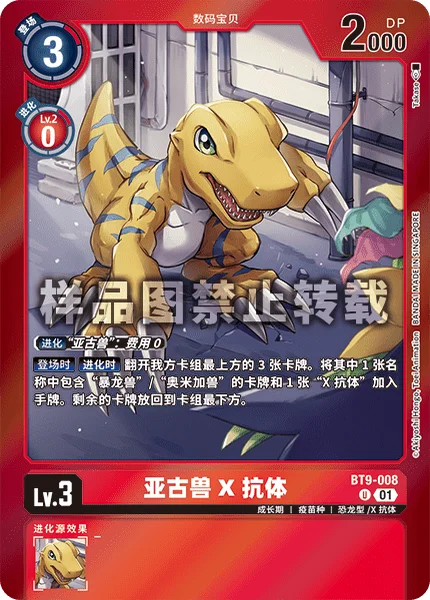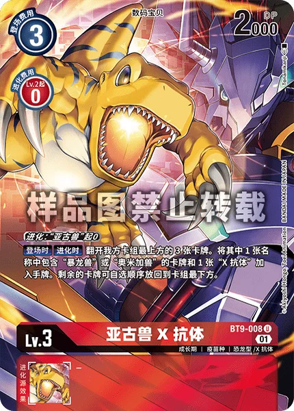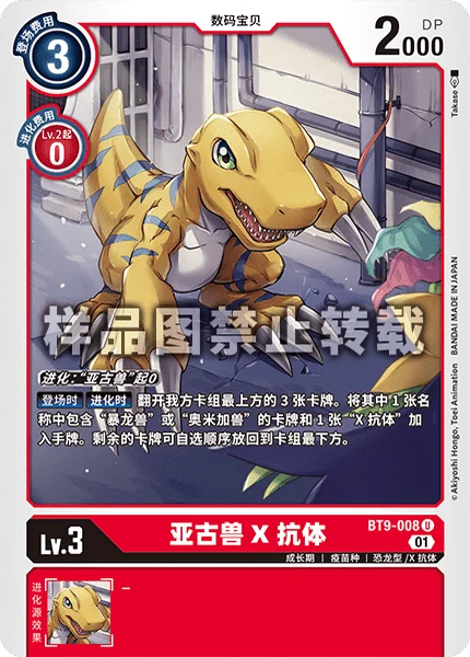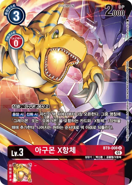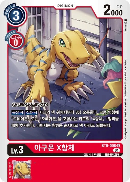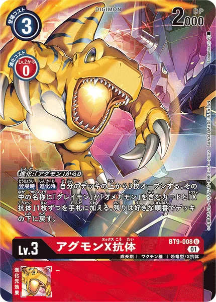 Digivolve 0 from [Agumon]On PlayWhen Digivolving Reveal the top 3 cards of your deck. Add 1 card with [Greymon] or [Omnimon] in its name and 1 [X Antibody] among them to your hand. Place the rest at the bottom of your deck in any order.