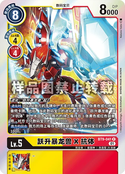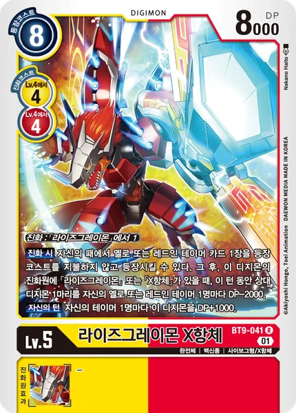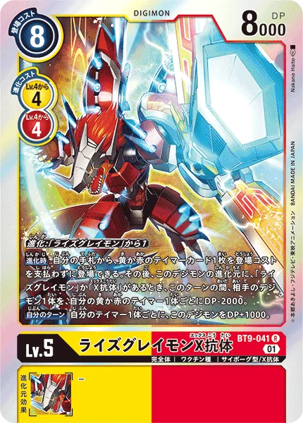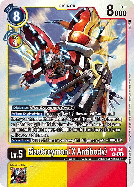 Digivolve 1 from [RizeGreymon]When Digivolving You may play 1 yellow or red Tamer card from your hand without paying its memory cost. Then, if [RizeGreymon] or [X Antibody] is in this Digimon's digivolution cards, 1 of your opponent's Digimon gets -2000 DP for the turn for each yellow or red Tamer you have in play. Your Turn For each Tamer you have in play, this Digimon gets +1000 DP.
