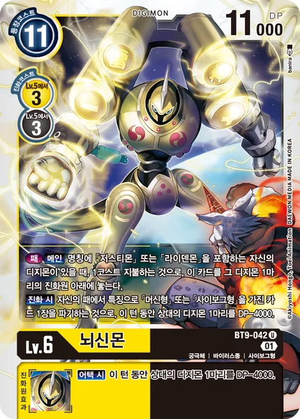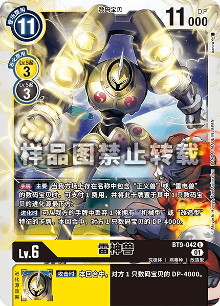 HandMain If you have a Digimon in play with [Justimon] or [Raidenmon] in its name, you may pay 1 memory to place this card under that Digimon as its bottom digivolution card.When Digivolving You may trash 1 Digimon card with [Machine] or [Cyborg] in its traits in your hand to have 1 of your opponent's Digimon get -4000 DP for the turn.
