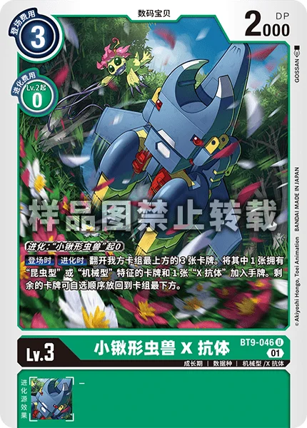 Digivolve 0 from [Kokuwamon]On PlayWhen Digivolving Reveal the top 3 cards of your deck. Add 1 card with [Insectoid] or [Machine] in its traits and 1 [X Antibody] among them to your hand. Place the rest at the bottom of your deck in any order.