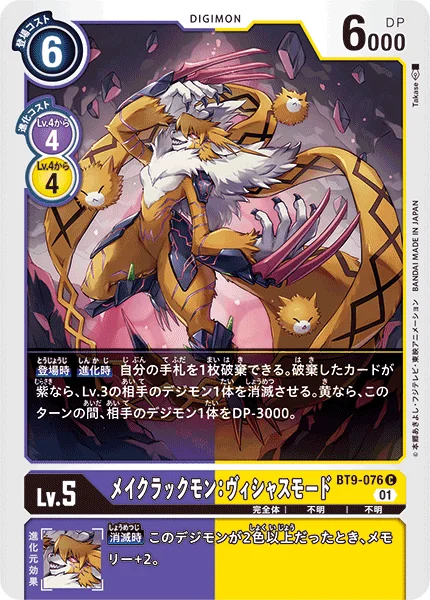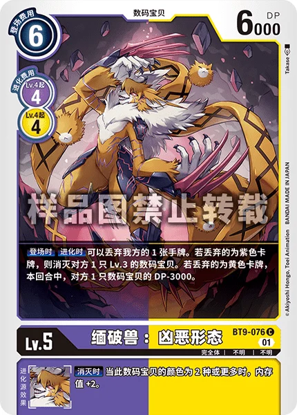 On PlayWhen Digivolving You may trash 1 card in your hand. If you trash a purple card, delete 1 of your opponent's level 3 Digimon. If you trash a yellow card, 1 of your opponent's Digimon gets -3000 DP for the turn.