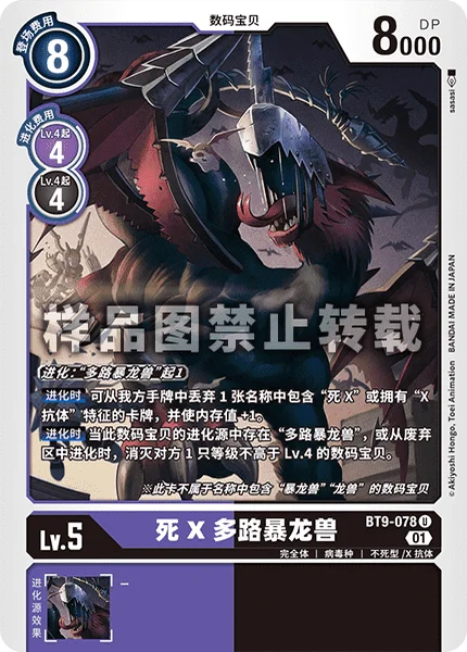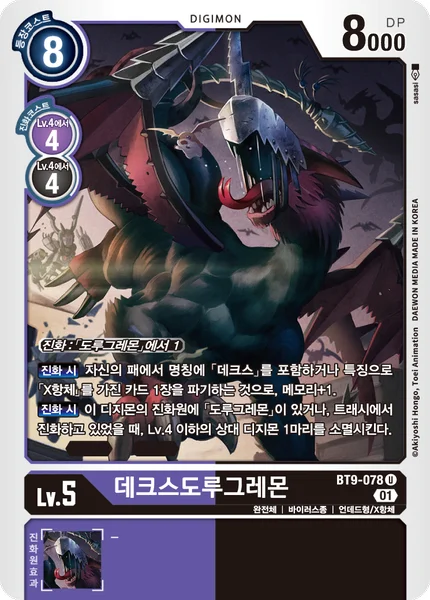 Digivolve 1 from [DoruGreymon]When Digivolving You may trash 1 card with [Dex] or [DeathX] in its name or [X Antibody] in its traits in your hand to gain 1 memory. When Digivolving If this Digimon has [DoruGreymon] in its digivolution cards or is digivolving from the trash, delete 1 of your opponent's level 4 or lower Digimon.