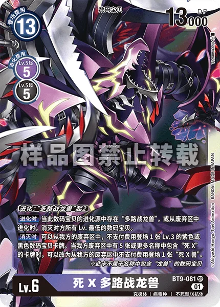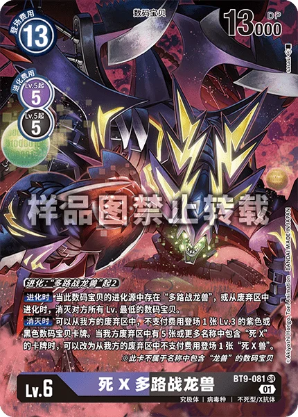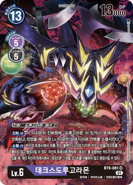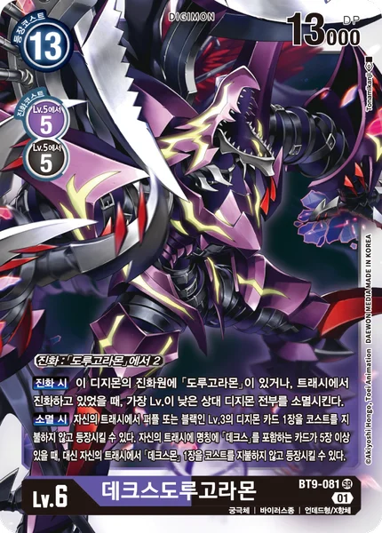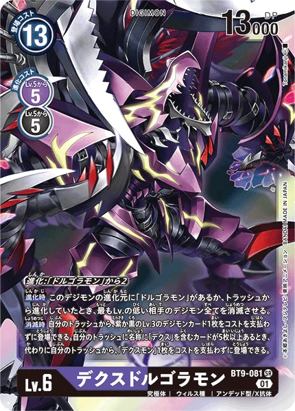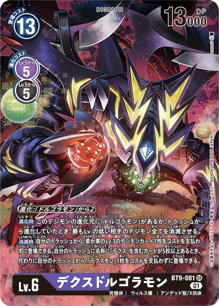 Digivolve 2 from [Dorugoramon]When Digivolving If this Digimon has [Dorugoramon] in its digivolution cards or is digivolving from the trash, delete all of your opponent's Digimon with the lowest level. On Deletion You may play 1 purple or black level 3 Digimon card from your trash without paying its memory cost. If you have 5 or more cards with [Dex] or [DeathX] in their names in your trash, you may play 1 [DeathXmon] from your trash without paying its memory cost instead.