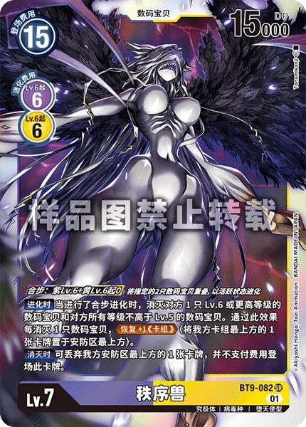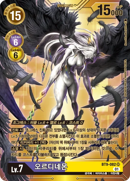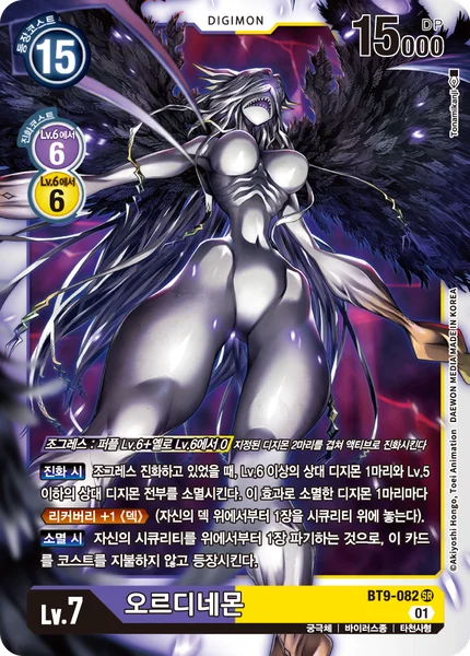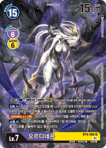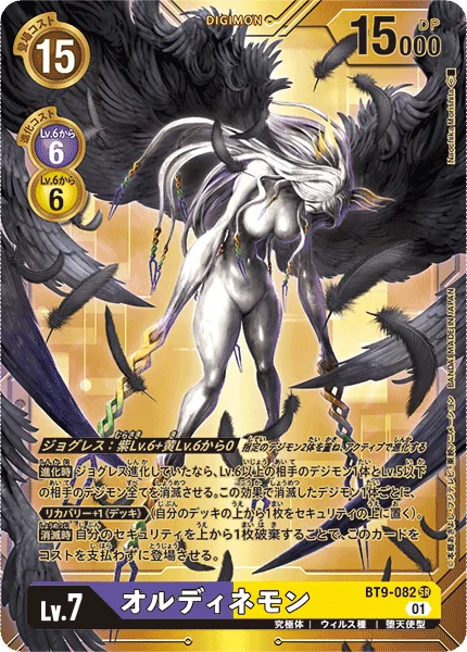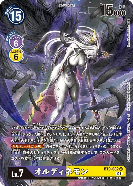 DNA Digivolution 0 fromPurpleLv.6 +YellowLv.6 Digivolve unsuspended with the 2 specified Digimon stacked on top of each other.When Digivolving When DNA digivolving, delete 1 of your opponent's level 6 or higher Digimon and all of their level 5 or lower Digimon. For each Digimon deleted by this effect, Recovery +1 (Deck). (Place the top card of your deck on top of your security stack.) On Deletion You may trash the top card of your security stack to play this card without paying its memory cost.