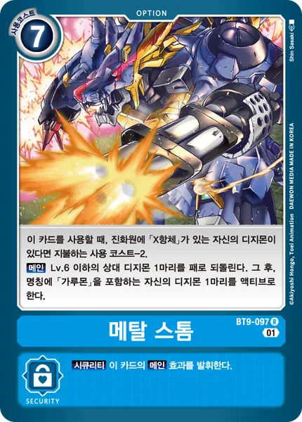 When you would use this card, if you have a Digimon with [X Antibody] in its digivolution cards in play, reduce the memory cost of this card by 2. Main Return 1 of your opponent's level 6 or lower Digimon to its owner's hand. Then, unsuspend 1 of your Digimon with [Garurumon] in its name.