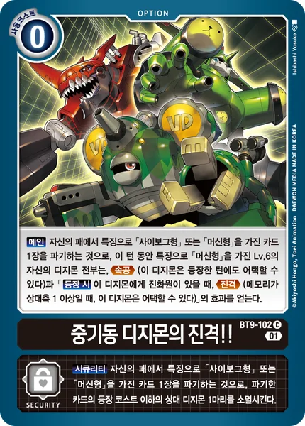 Security You may trash 1 Digimon card with [Cyborg] or [Machine] in its traits in your hand to delete 1 of your opponent's Digimon whose play cost is less than or equal to the trashed card's play cost.