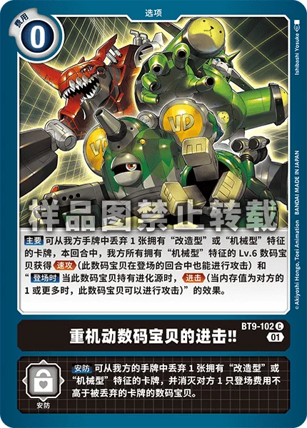 Main You may trash 1 card with [Cyborg] or [Machine] in its traits in your hand to have all of your level 6 Digimon with [Machine] in their traits gain Rush (This Digimon can attack the turn it comes into play) and “On Play If this Digimon has a digivolution card, Blitz. (This Digimon can attack when your opponent has 1 or more memory.)” for the turn.