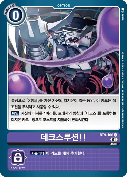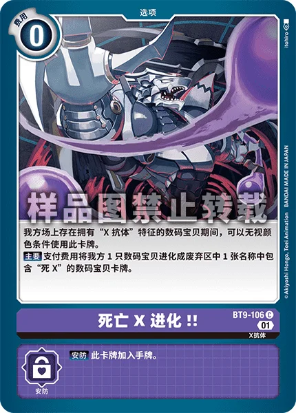 While you have a Digimon with [X Antibody] in its traits in play, you may use this card without meeting its color requirements. Main You may digivolve 1 of your Digimon into a Digimon card with [Dex] or [DeathX] in its name from your trash for its memory cost.