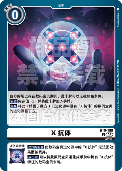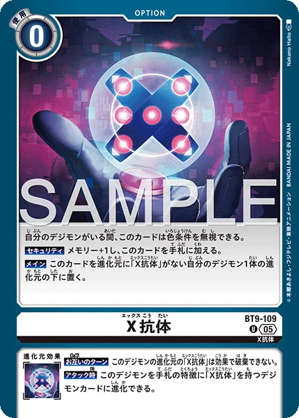 All Turns Effects can't trash [X Antibody] in this Digimon's digivolution cards.When Attacking This Digimon can digivolve into a Digimon card with [X Antibody] in its traits in your hand for its digivolution cost.