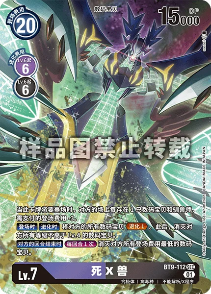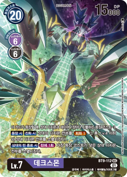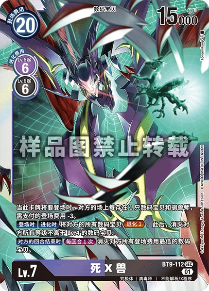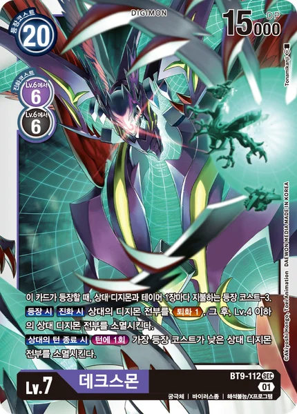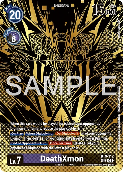 When you would play this card, reduce its memory cost by 3 for each Digimon and Tamer your opponent has in play. On PlayWhen Digivolving De-Digivolve 1 all of your opponent's Digimon. Then, delete all of your opponent's level 4 or lower Digimon. End of Opponent's TurnOnce Per Turn Delete all of your opponent's Digimon with the lowest play cost.