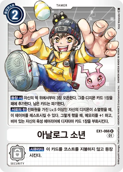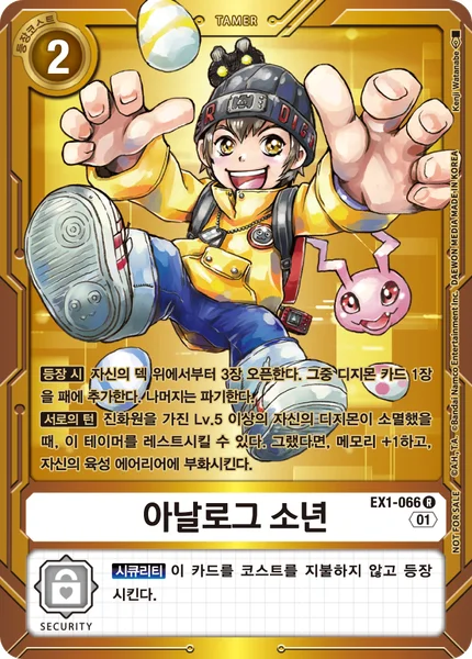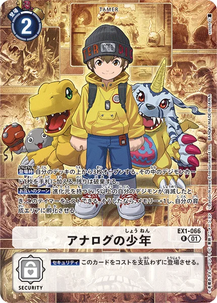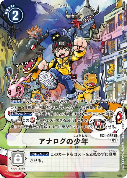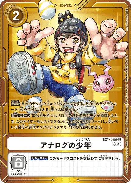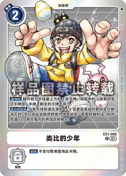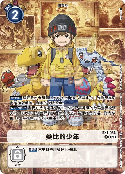 All Turns When any of your level 5 or higher Digimon with digivolution cards are deleted, this Tamer may suspend. If it did, gain 1 memory and hatch in your breeding area.