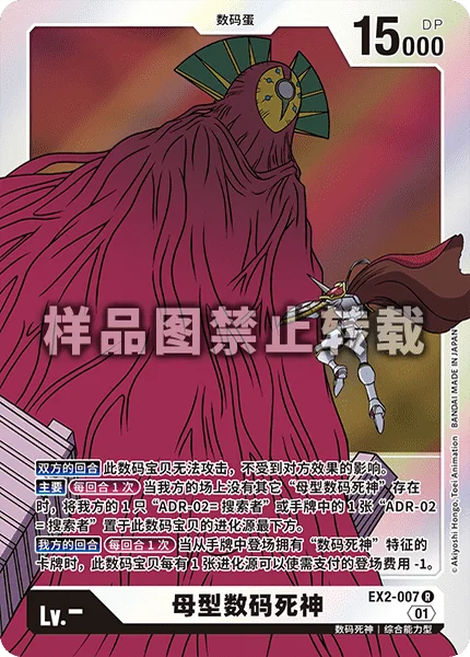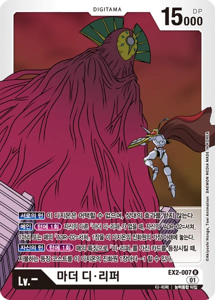 All Turns This Digimon can't attack and isn't affected by your opponent's effects.MainOnce Per Turn If you don't have another [Mother D-Reaper] in play, place 1 of your [ADR-02 Searcher]s from in play or from your hand under this Digimon as its bottom digivolution card.Your TurnOnce Per Turn When you would play a card with [D-Reaper] in its traits from your hand, you may reduce its play cost by 1 for each of this Digimon's digivolution cards.