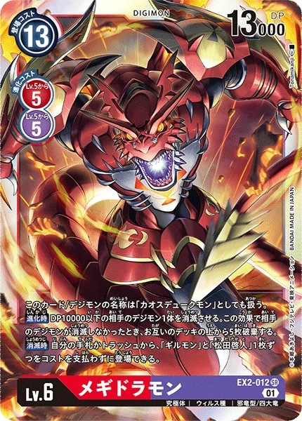 When Digivolving Delete 1 of your opponent's Digimon with 10000 DP or less. If no Digimon was deleted by this effect, trash the top 5 cards of both players' decks.On Deletion You may play 1 [Guilmon] and 1 [Takato Matsuki] from your hand and/or trash without paying their memory costs.