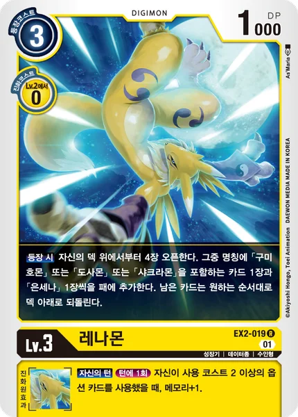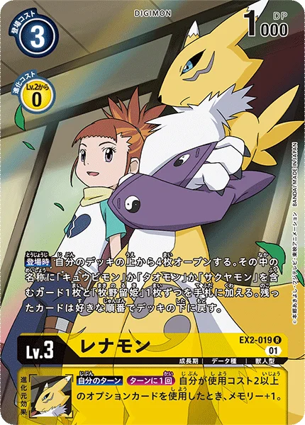 On Play Reveal the top 4 cards of your deck. Add 1 card with [Kyubimon], [Taomon], or [Sakuyamon] in its name and 1 [Rika Nonaka] among them to your hand. Place the remaining cards at the bottom of your deck in any order.