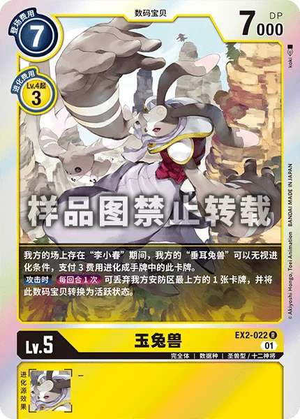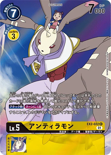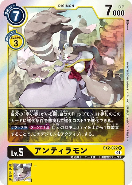 If you have [Shu-Chong Wong] in play, your [Lopmon] can digivolve into this card in your hand for a digivolution cost of 3, ignoring its digivolution requirements.When AttackingOnce Per Turn You may trash the top card of your security stack to unsuspend this Digimon.