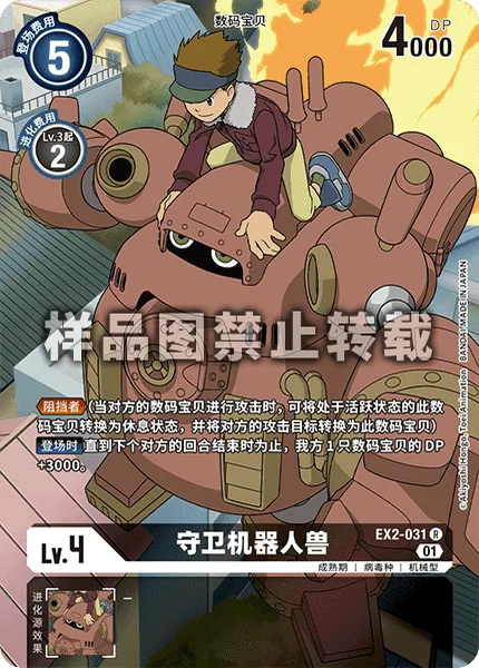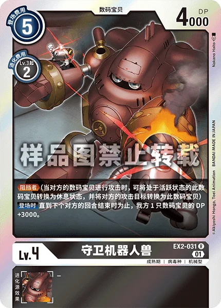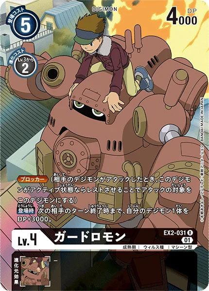 Blocker (When an opponent's Digimon attacks, you may suspend this Digimon to force the opponent to attack it instead.)On Play 1 of your Digimon gets +3000 DP until the end of your opponent's turn.