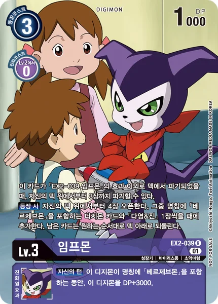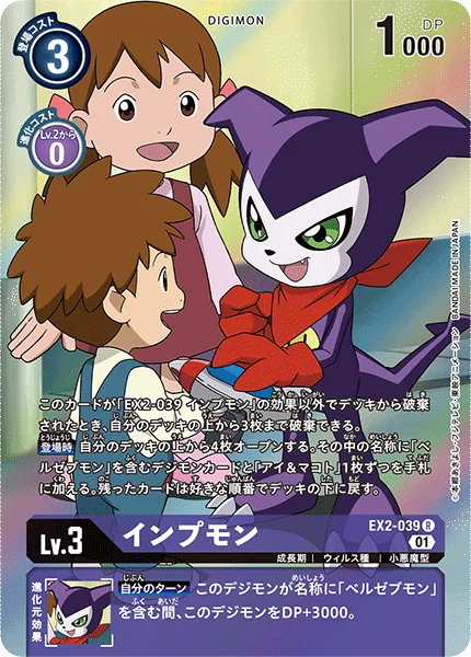 When this card is trashed from your deck, if it wasn't trashed by [EX2-039 Impmon]'s effect, you may trash up to 3 cards from the top of your deck.On Play Reveal the top 4 cards of your deck. Add 1 Digimon card with [Beelzemon] in its name and 1 [Ai & Mako] among them to your hand. Place the remaining cards at the bottom of your deck in any order.