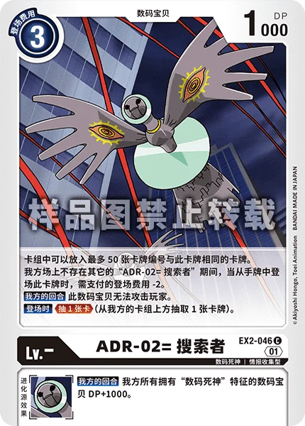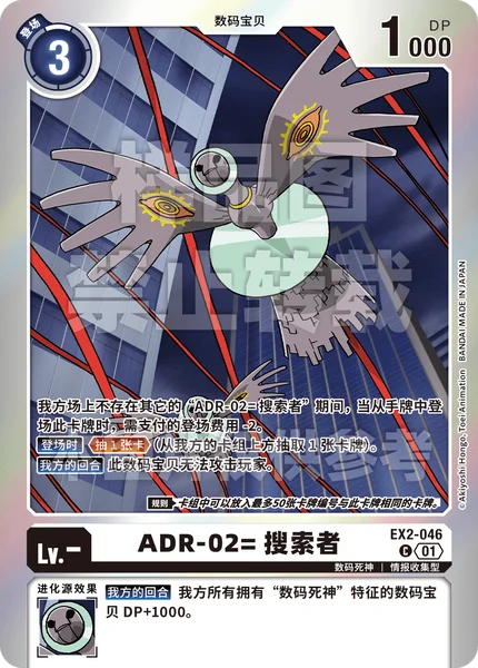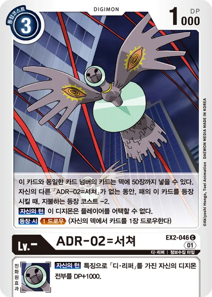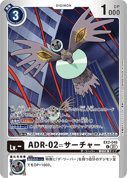 When you would play this card from your hand, reduce its play cost by 2 if you don't have another [ADR-02 Searcher] in play.Your Turn This Digimon can't attack players.On PlayDraw 1 (Draw 1 card from your deck.)