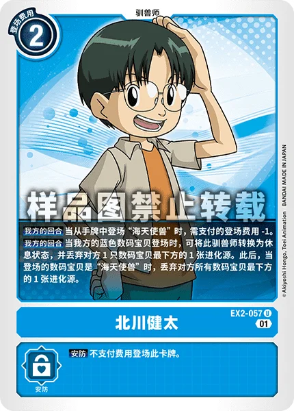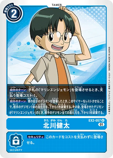 Your Turn When you would play a [MarineAngemon] from your hand, reduce its play cost by 1.Your Turn When you play a blue Digimon, you may suspend this Tamer to trash the bottom digivolution card of 1 of your opponent's Digimon. Then, if the Digimon played is [MarineAngemon], trash the bottom digivolution card of all of your opponent's Digimon.