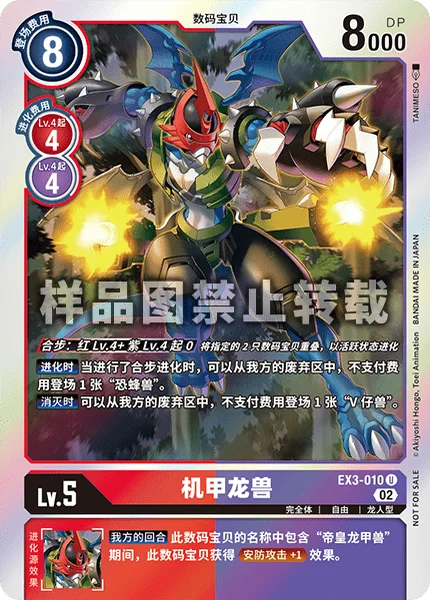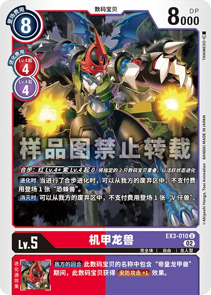 DNA Digivolution 0 fromRedLv.4 +PurpleLv.4When Digivolving When DNA digivolving, you may play 1 [Dinobeemon] from your trash without paying the cost.On Deletion You may play 1 [Veemon] from your trash without paying the cost.