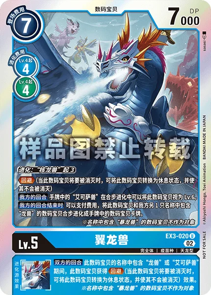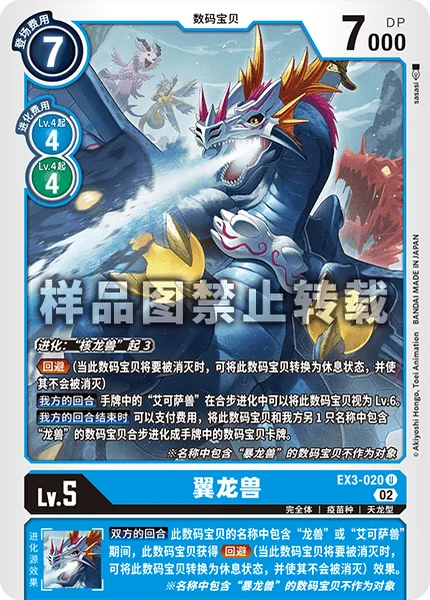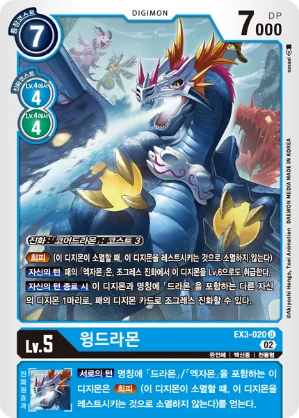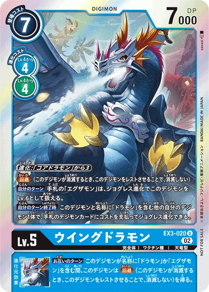 Digivolve 3 from [Coredramon]Evade (When this Digimon would be deleted, you may suspend it to prevent that deletion.)Your Turn [Examon] in your hand can treat this Digimon as level 6 for DNA Digivolution.End of Your Turn This Digimon and 1 of your other Digimon with [Dramon] in its name may DNA digivolve into a Digimon card in your hand by paying its DNA digivolve cost.