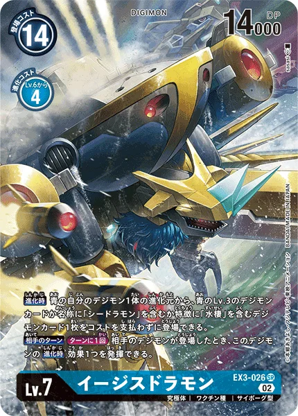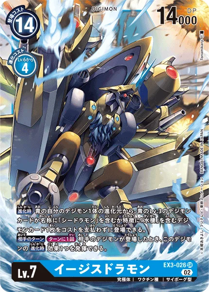 When Digivolving You may play 1 blue level 3 Digimon card or 1 Digimon card with [Seadramon] in its name or [Aqua] or [Sea Animal] in one of its traits from one of your blue Digimon's digivolution cards without paying its memory cost.Opponent's TurnOnce Per Turn When your opponent plays a Digimon, you may activate 1 of this Digimon's When Digivolving effects.