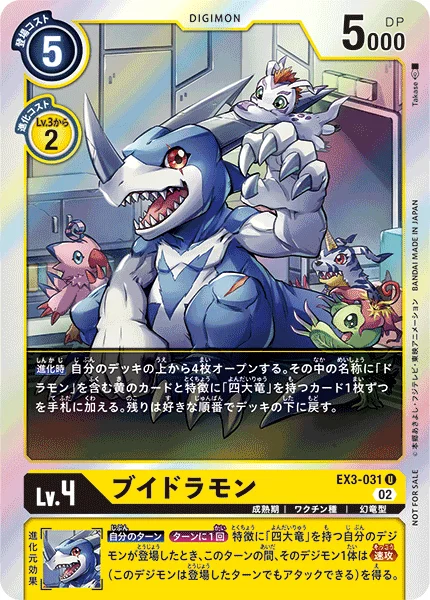 When Digivolving Reveal the top 4 cards of your deck. Add 1 yellow card with [Dramon] in its name and 1 card with [Four Great Dragons] in its traits among them to your hand. Place the rest at the bottom of your deck in any order.