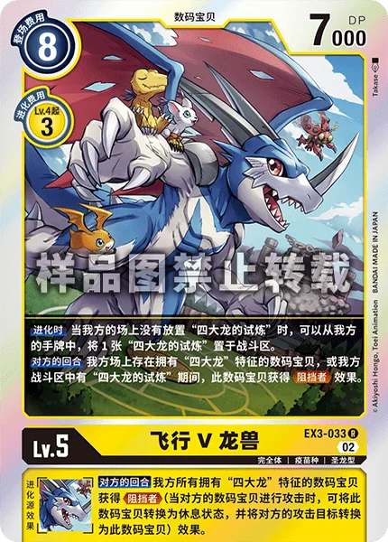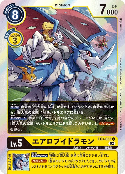When Digivolving If you don't have a [Trial of the Four Great Dragons] in play, you may place 1 [Trial of the Four Great Dragons] from your hand in your battle area.Opponent's Turn While you have a Digimon with [Four Great Dragons] in its traits in play, or [Trial of the Four Great Dragons] is in your battle area, this Digimon gains Blocker.
