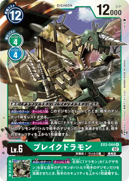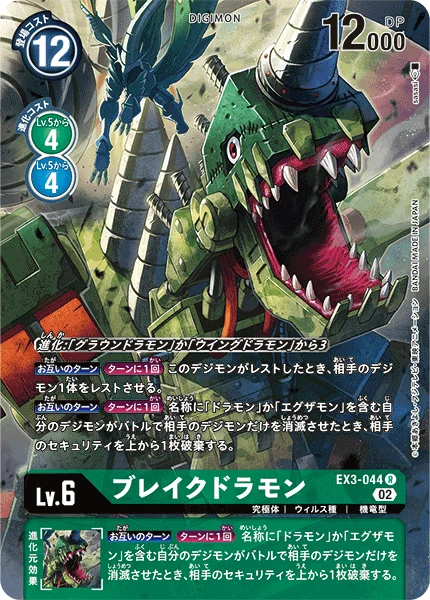 Digivolve 3 from [Groundramon] or [Wingdramon]All TurnsOnce Per Turn When this Digimon becomes suspended, suspend 1 of your opponent's Digimon.All TurnsOnce Per Turn When one of your Digimon with [Dramon] or [Examon] in its name deletes an opponent's Digimon in battle and survives, trash the top card of your opponent's security stack.