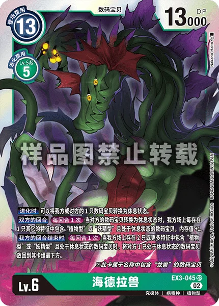 When Digivolving You may suspend 1 Digimon.All Turns Once Per Turn When an opponent's Digimon becomes suspended, for each other suspended Digimon with [Vegetation], [Plant], or [Fairy] in one of their traits you have in play, gain 1 memory.End of Your Turn Once Per Turn If you have 2 or more suspended Digimon with [Vegetation], [Plant], or [Fairy] in one of their traits, return 1 of your opponent's suspended Digimon to the bottom of its owner's deck.