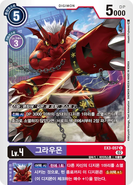 Digivolve 2 if name contains [Guilmon]When Digivolving Delete 1 of your opponent's Digimon with 3000 DP or less. If no Digimon is deleted by this effect, trash the top 2 cards of both players' decks.