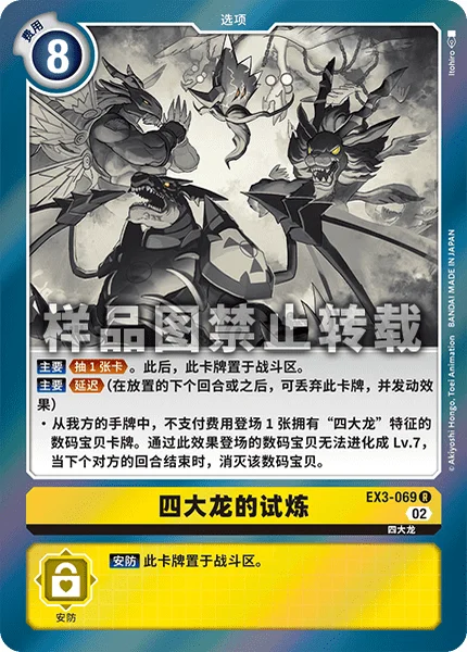 Main Draw 1. Then, place this card in your battle area.Main Delay (By trashing this card in your battle area, activate the effect below. You can't activate this effect the turn this card enters play.)・Play 1 Digimon card with [Four Great Dragons] in its traits from your hand without paying the cost. The Digimon played by this effect can't digivolve to level 7, and at the next end of your opponent's turn, delete that Digimon.