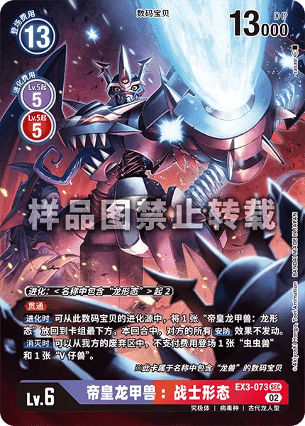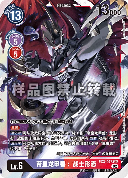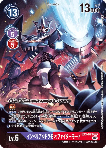 Digivolve 2 if name contains [Dragon Mode]PiercingWhen Digivolving By returning 1 [Imperialdramon: Dragon Mode] from this Digimon's digivolution cards to the bottom of its owner's deck, none of your opponent's Security effects can activate for the turn.On Deletion You may play 1 [Wormmon] and 1 [Veemon] from your trash without paying the costs.