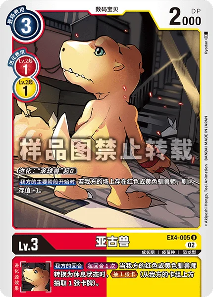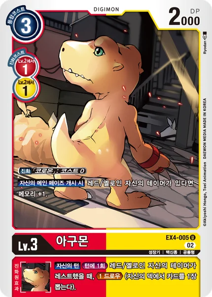 Digivolve 0 from [Koromon]Start of Your Main Phase If you have a red or yellow Tamer in play, gain 1 memory.