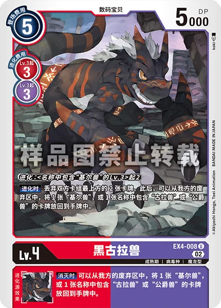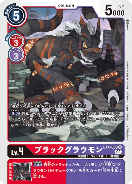 Digivolve 2 from Lv.3 w/[Guilmon] in nameWhen Digivolving Trash the top 2 cards of both players' decks. Then, you may return 1 [Guilmon] or 1 card with [Growlmon] or [Gallantmon] in its name from your trash to your hand.