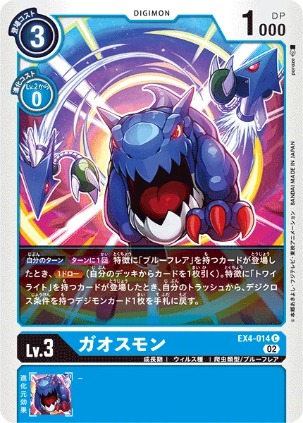 Your TurnOnce Per Turn When a card with the [Blue Flare] trait is played, Draw 1. (Draw 1 card from your deck.) When a card with the [Twilight] trait is played, return 1 Digimon card with DigiXros requirements from your trash to your hand.