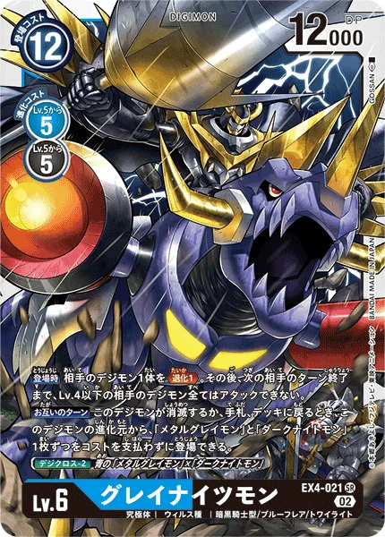 All Turns When this Digimon would be deleted or returned to your hand or deck, you may play 1 [MetalGreymon] and 1 [DarkKnightmon] from this Digimon's digivolution cards without paying the costs.