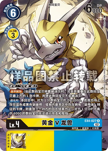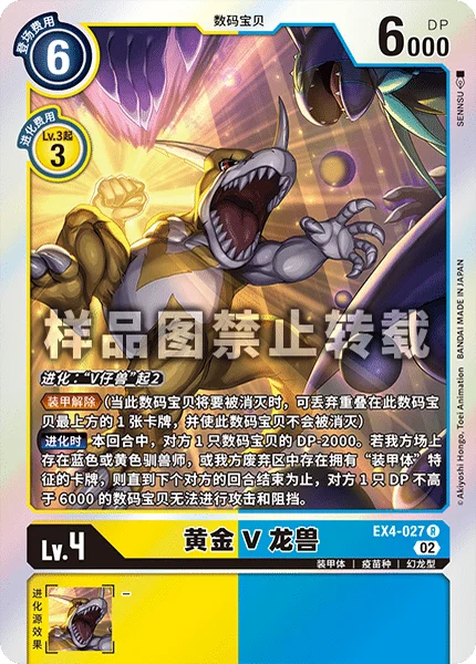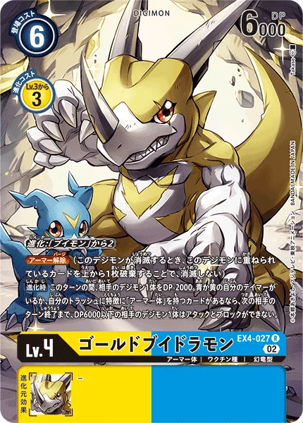 When Digivolving 1 of your opponent's Digimon gets -2000 DP for the turn. If you have a blue or yellow Tamer in play, or if you have a card with the [Armor Form] trait in your trash, 1 of your opponent's Digimon with 6000 DP or less can't attack or block until the end of your opponent's turn.