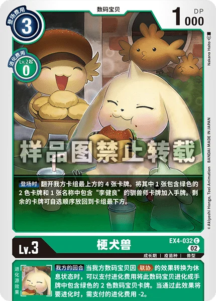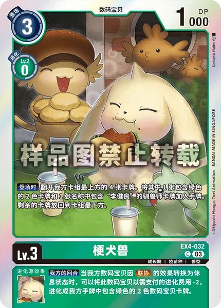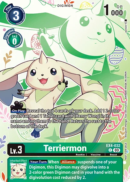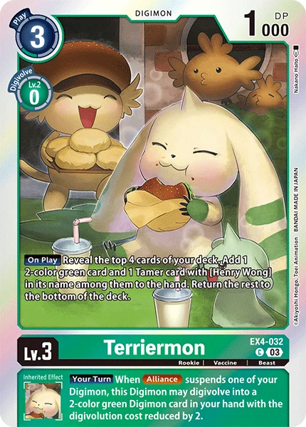 Your Turn When Alliance suspends one of your Digimon, this Digimon may digivolve into a 2-color green Digimon card in your hand for the cost. When this Digimon would digivolve by this effect, reduce the cost by 2.